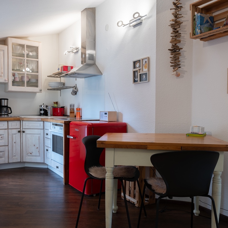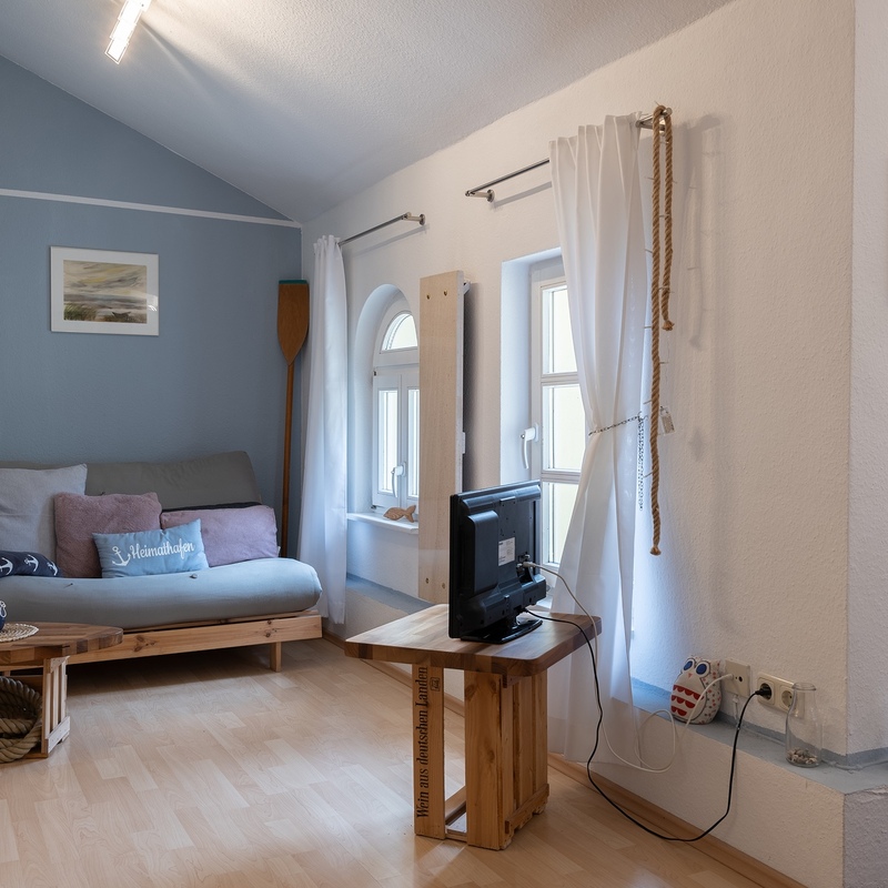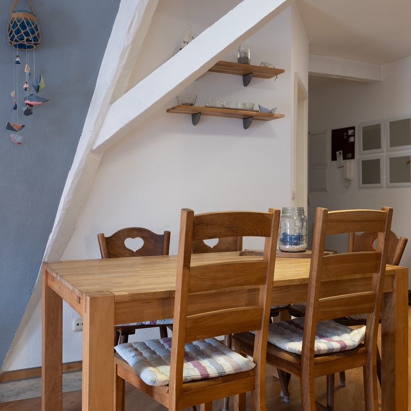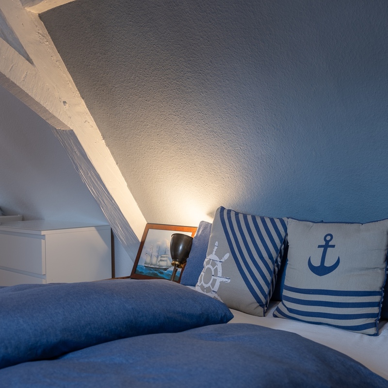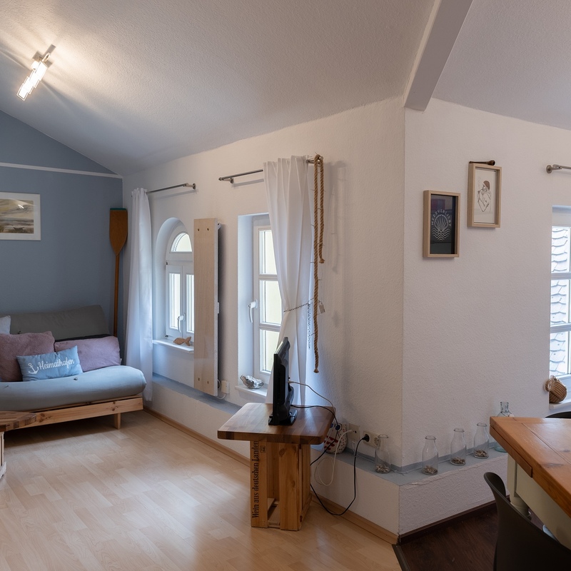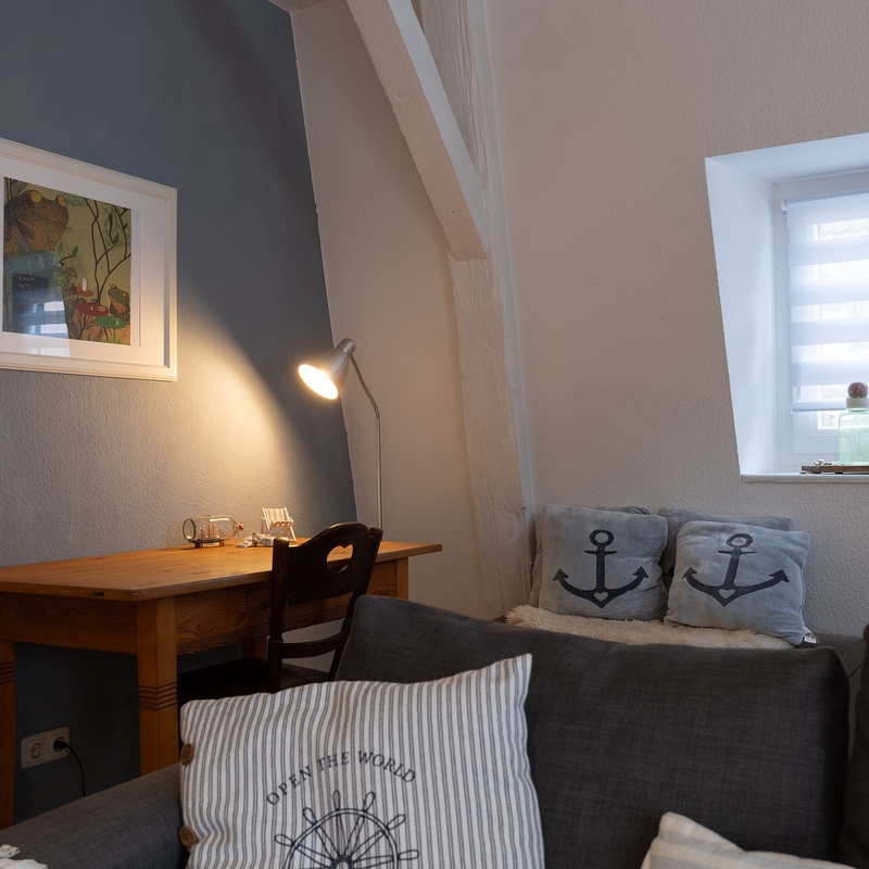 Hier muss das Herz entscheiden, ob der Blick nach draußen oder die maritime Einrichtung die Seele mehr berührt. Durch den großzügigen Schnitt der Wohnung fühlt sich jeder sofort eingeladen wie zuhause. Mit einem Schoppen Wein, den Sie gerne bei Ihrem Gastgeber erwerben können, lassen Sie den Abend mit Blick auf die Katharinenkirche oder in unserem mediterranen Innenhof ausklingen.